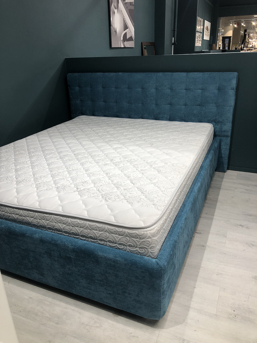 Современная и стильная интерьерная кровать. Модель изготовлена из ДСП. В комплект кровати входит кроватное основание. Каркас основания выполнен из металла, ламели — из берёзы. Кровать может включать подъёмный механизм с бельевым ящиком, который существенно увеличит объём хранения вещей, а так же позволит легко производить уборку пыли под кроватью.