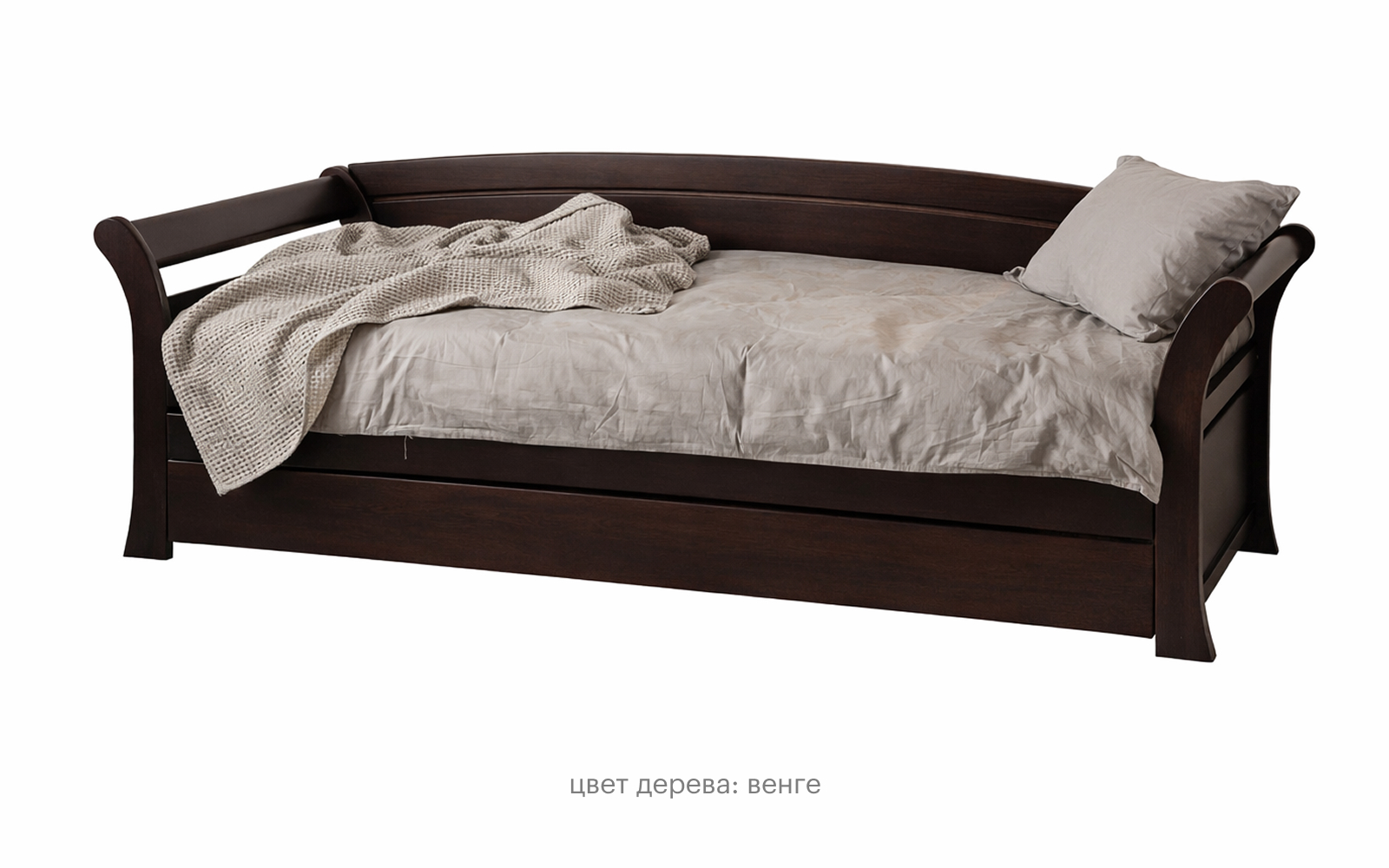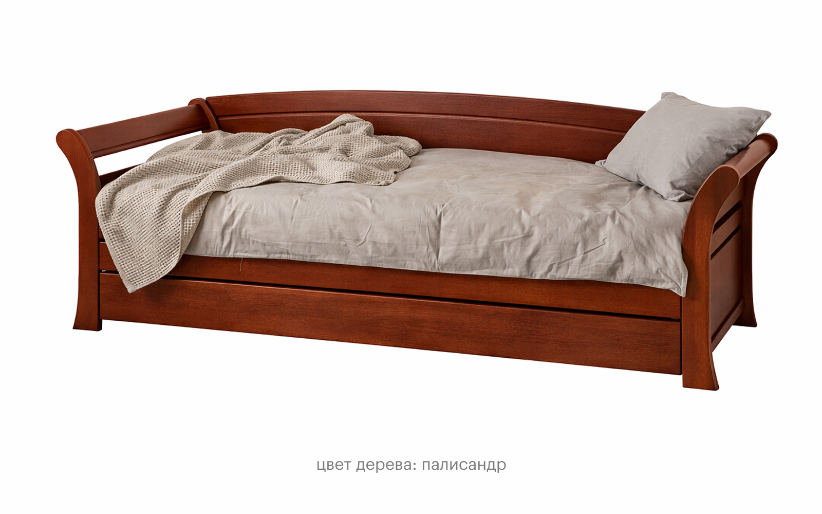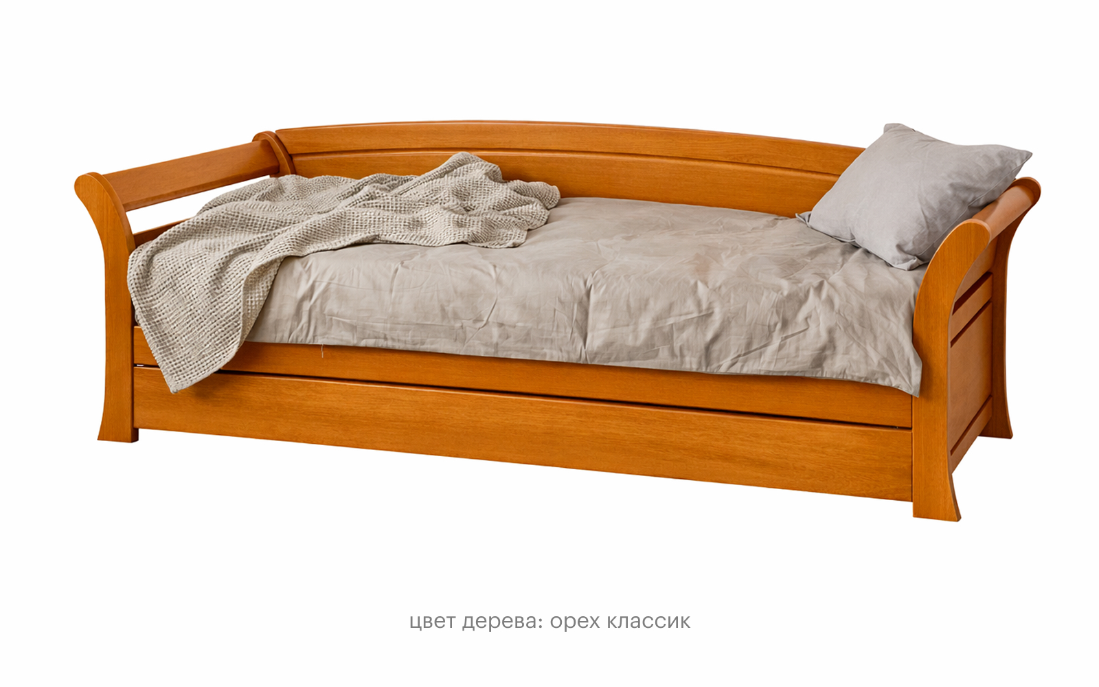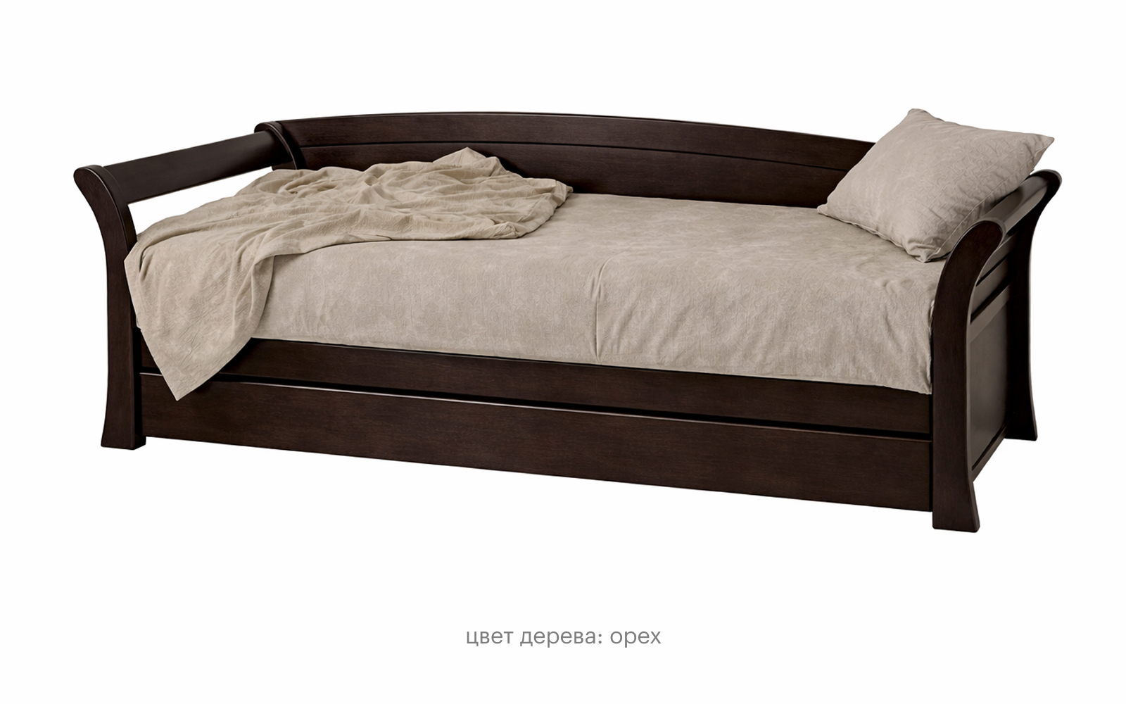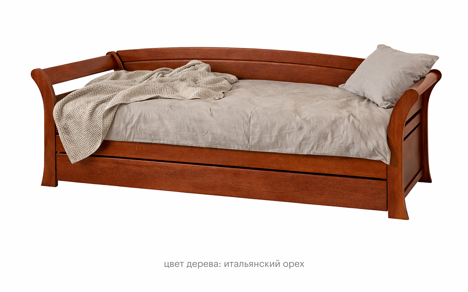 Выбранная комплектация: размер: 80×190 см; цвет дерева: Орех; основание: Реечное основание без ящика; материал корпуса: Массив бука