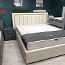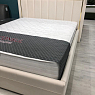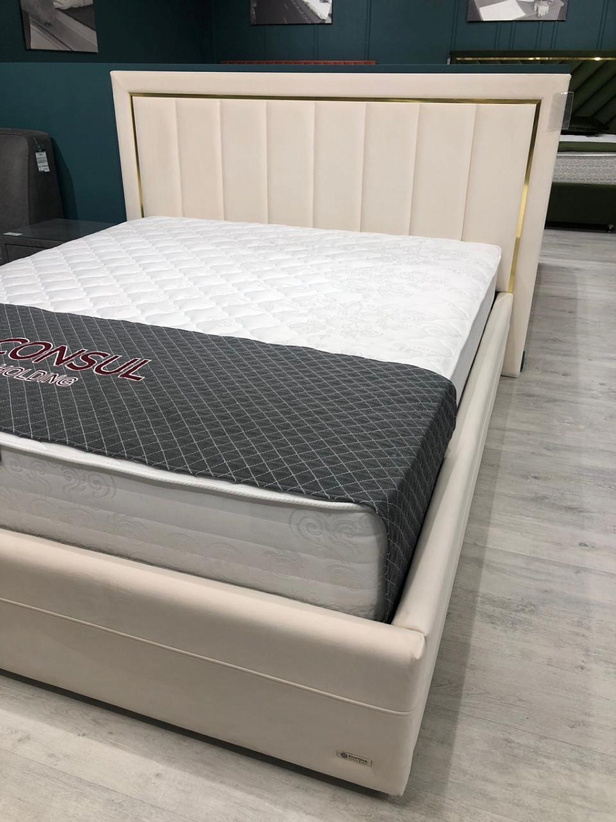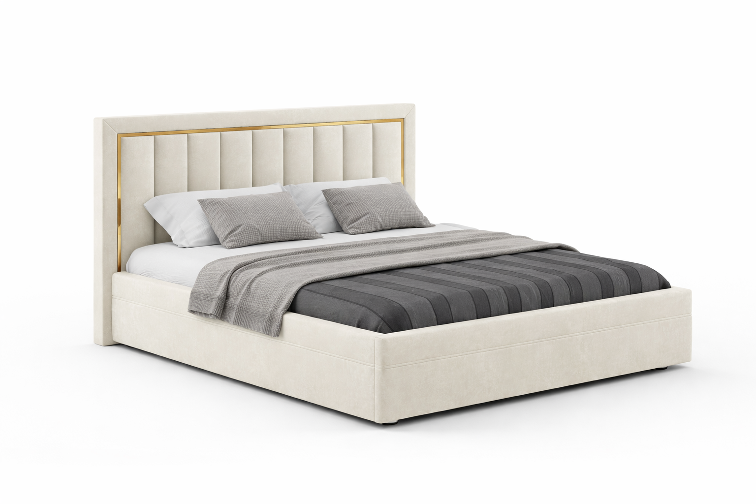 Эта кровать — спокойный диалог формы и тактильности: мягкая обивка словно приглушает пространство, а строгая геометрия изголовья добавляет интерьеру собранность и ритм. Светлый велюр в сочетании с серым текстилем создаёт ощущение уюта без лишней тяжести — место, где хочется замедлиться и выдохнуть.