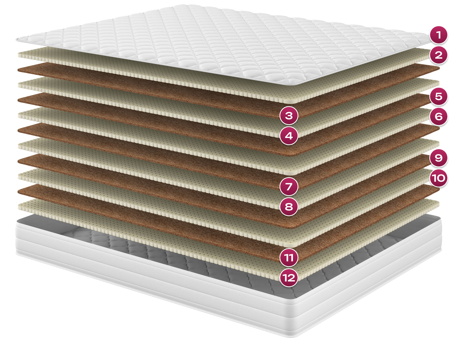 Экологически чистый и долговечный материал из межплодника ореха кокосовой пальмы. Она не вызывает аллергии и обладает благотворным биополем. В матрасах койра обеспечивает упругость и долговечность, а латексная пропитка устраняет ломкость и увеличивает срок службы, создавая прочную и долговечную плиту.